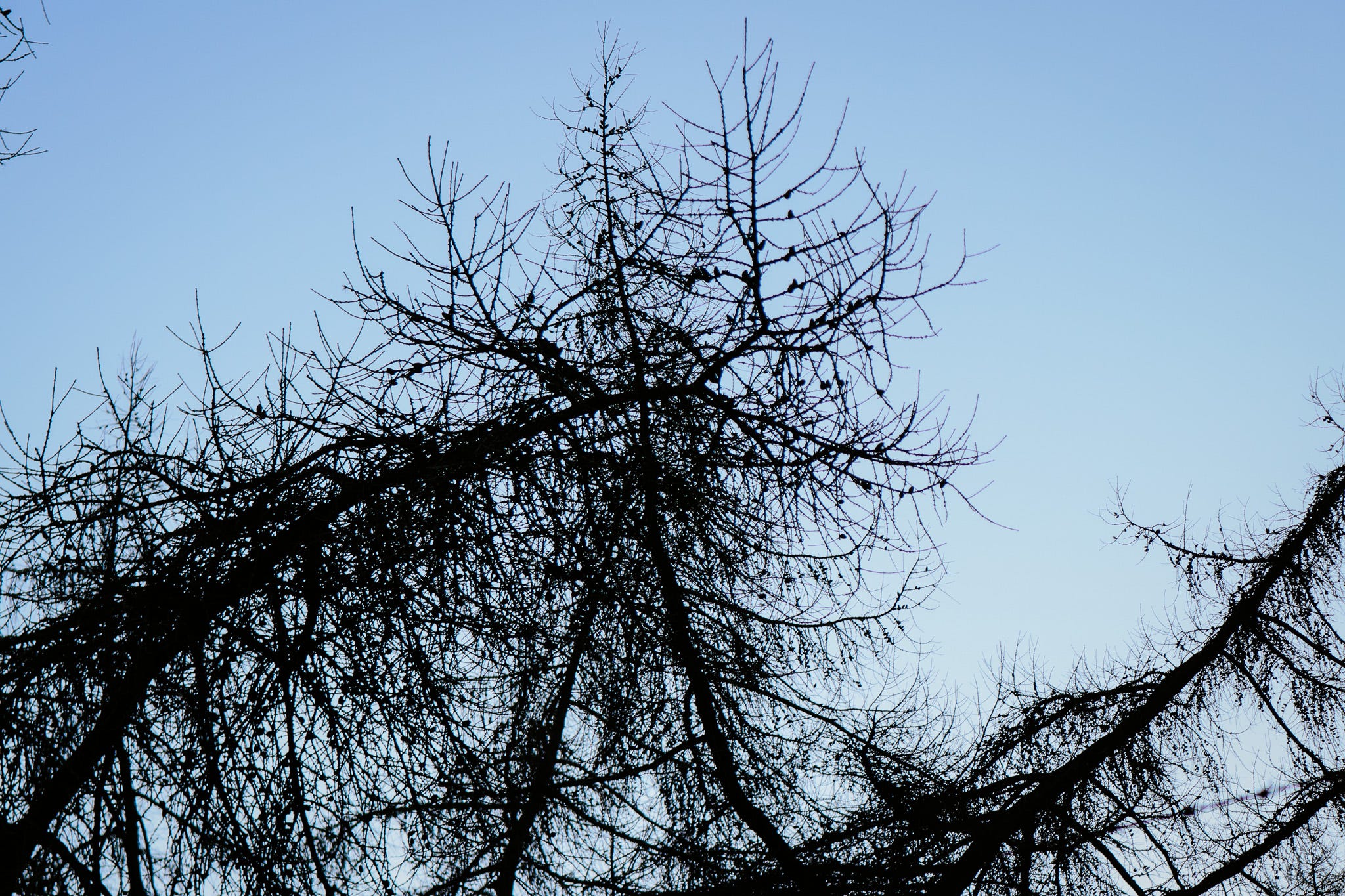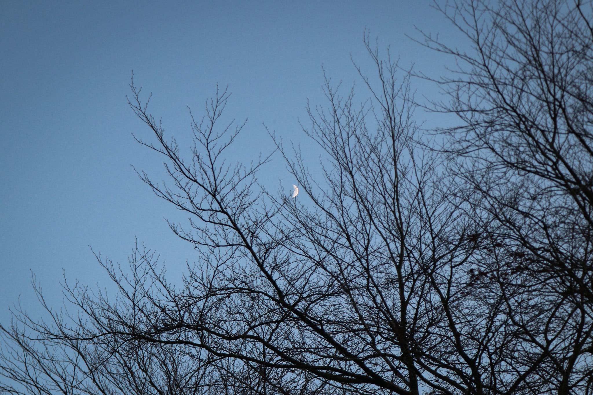 By the time we stop and climb out of the car, the moon’s up and the sky’s turning rosy. A wash of blue, fir and larch branches silhouetted against it.