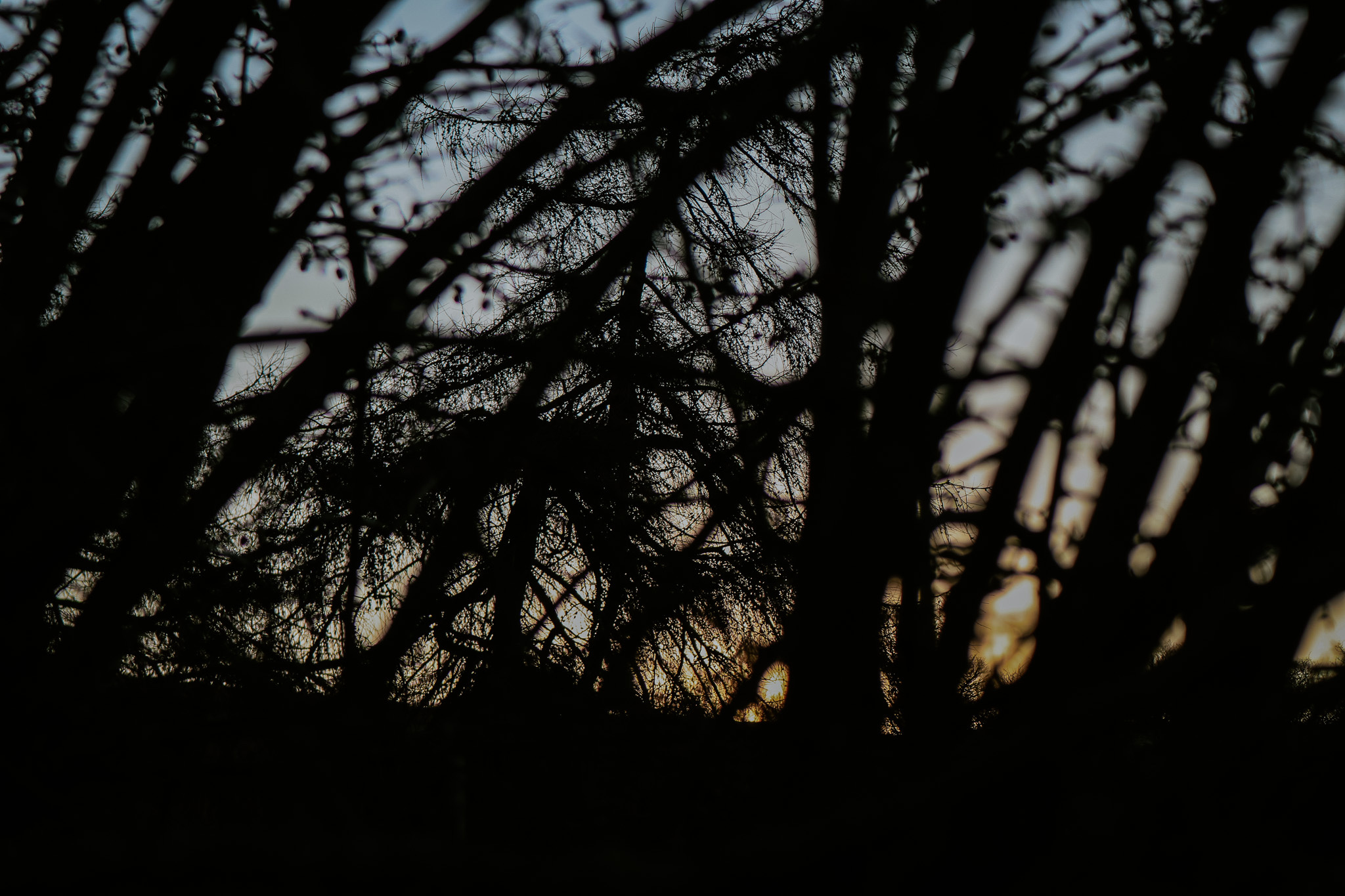 We head upwards through the woods. The sun’s setting behind the trees. Suddenly, it’s dusk.