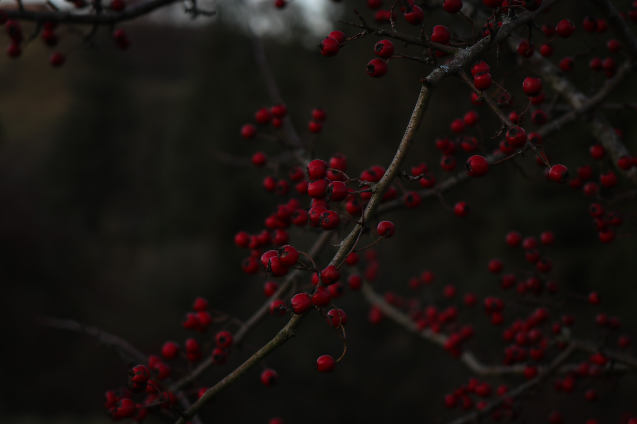 Hawthorns are covered with their bright, jewel-like berries. Their stems and twigs are gilded and encrusted with lichen, sulphur-yellow and verdigris.